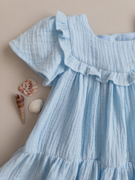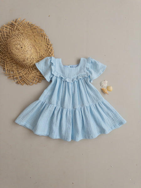 Vestido confeccionado a mano con mangas en forma de bolados, detalle de pechera con bolado sutiles, la pollera tambien tiene bolados y el vestido cuenta con botones en la parte trasera. Es una prenda super fresca y versátil. Tu bebé va a usarlo tanto para un día en casa normal o para algún evento que tengas y quieras que tu pequeña se luzca.